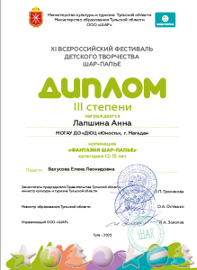 Она завоевала диплом третьей степени в номинации «Фантазия Шар-Папье» среди участников 12-15 лет.